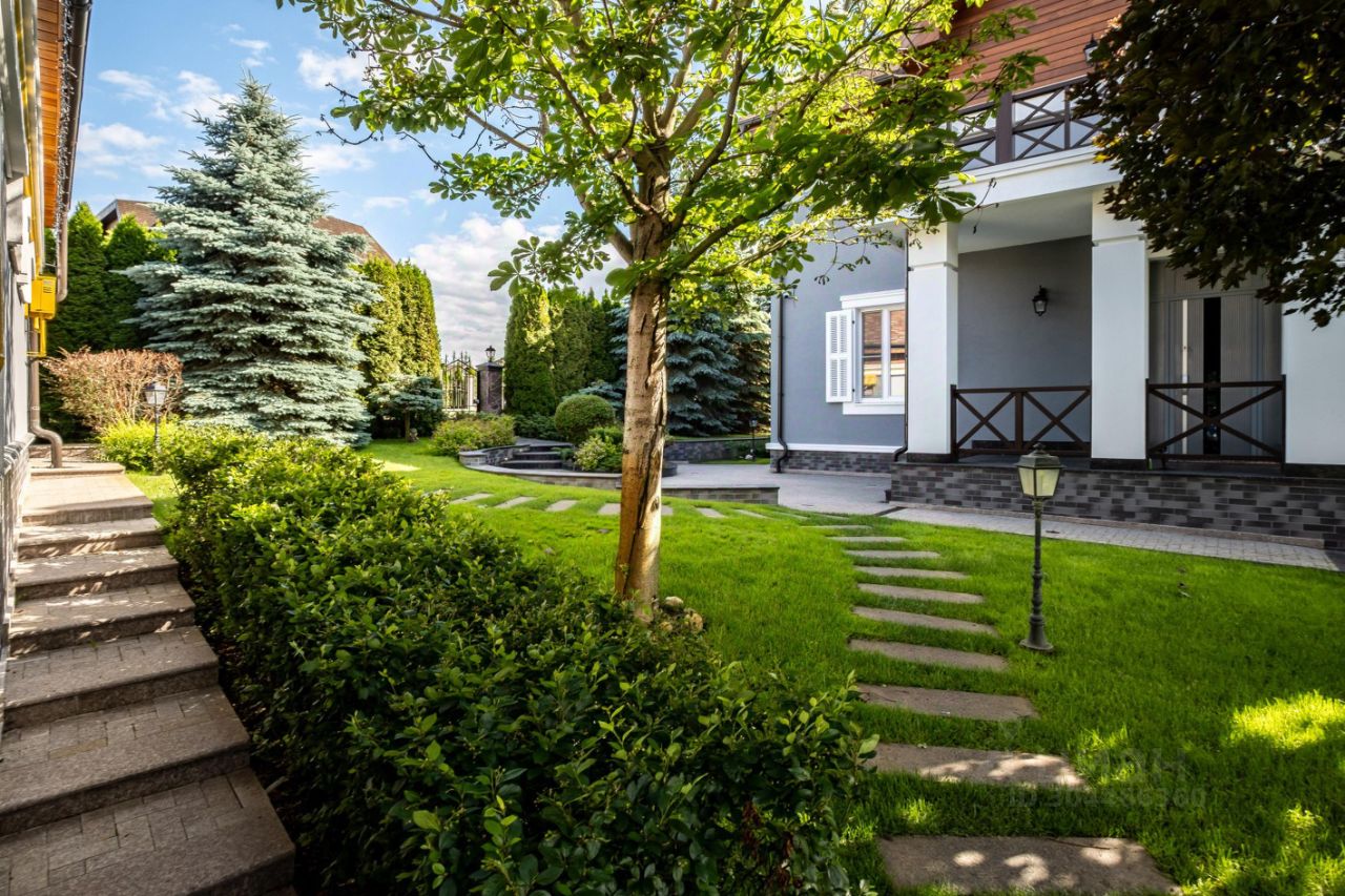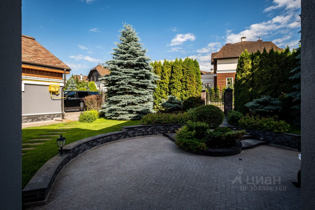 Участок правильной формы, ухоженный газон, высажены декоративные деревья и кустарники, выполнен дренаж с выводом в канализацию. Дорожки вымощены натуральным камнем. Ограждение кованный забор, на кирпичных столбах облицованных натуральным камнем. Въезд на участок осуществляется через автоматические ворота с электроприводом. Парковка на 2 авто, выложена брусчаткой, детская площадка. По периметру туи и ели.
