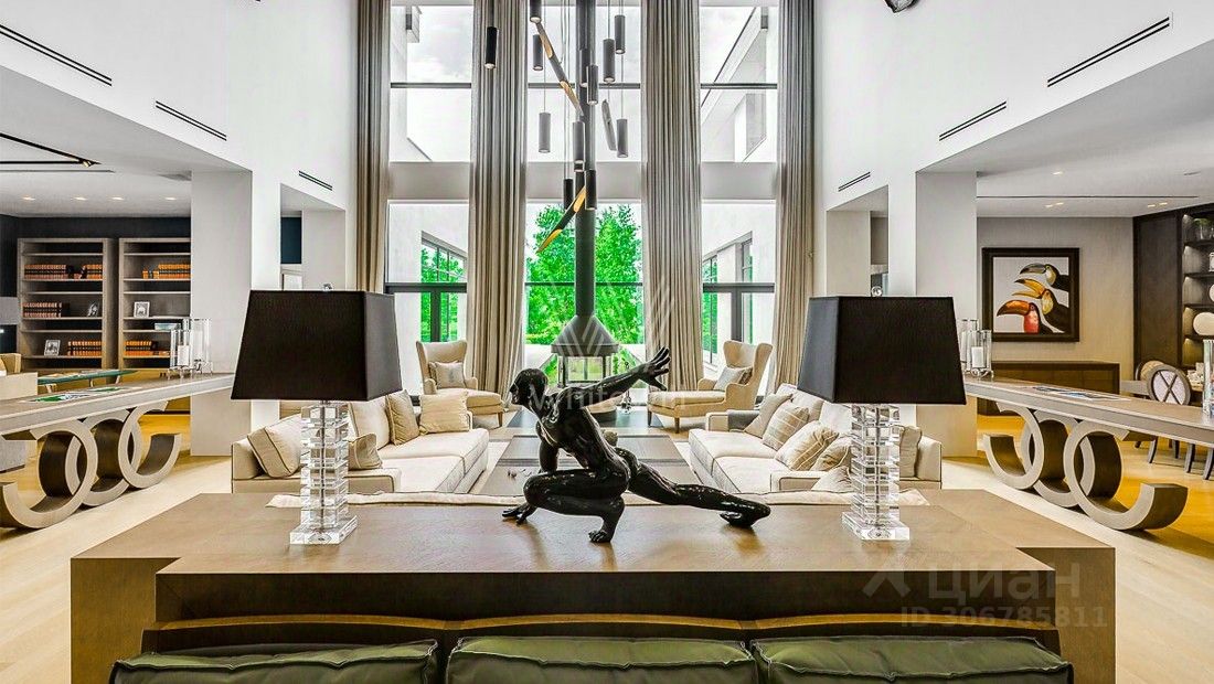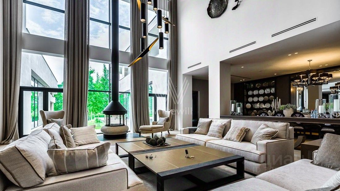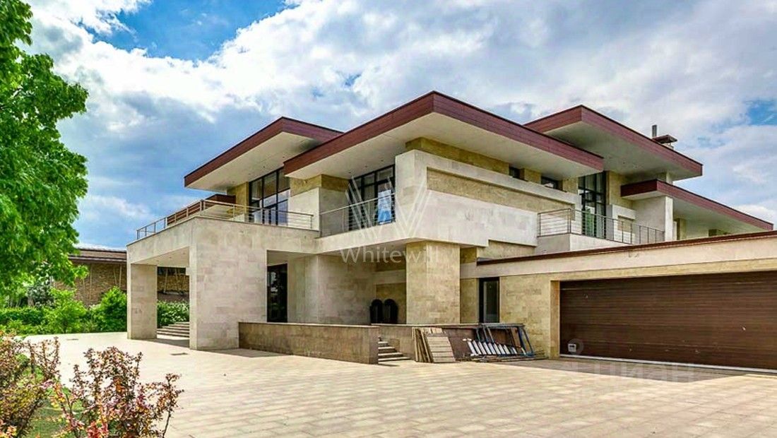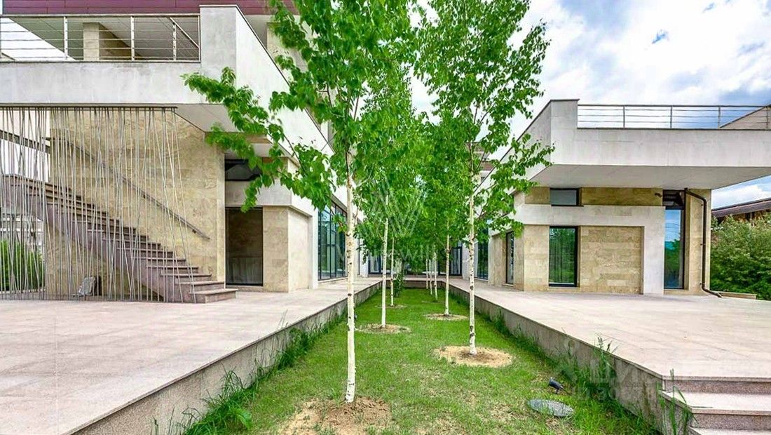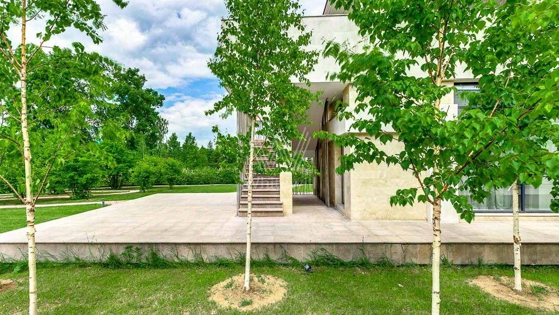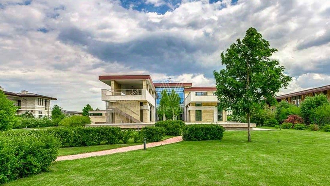 Жуковка 21. Просторная загородная резиденция в стиле американского архитектора Френка Ллойда Райта площадью 1509 м² построена на открытом участке 50 соток. Дом со множеством открытых террас облицован натуральным камнем песочного оттенка. В первый этаж встроен гараж для машин. Представительная резиденция оформлена в современном стиле, мебель и аксессуары подобраны из дизайнерских коллекций. Главная гостиная дома имеет панорамное двухуровневое остекление. Кухня, санузлы, гардеробные оборудованы техникой и мебелью. На участке выполнили ландшафтный дизайн, засеяли газон, дорожки вымостили плиткой, посадили декоративные кустарники и молодые березы.