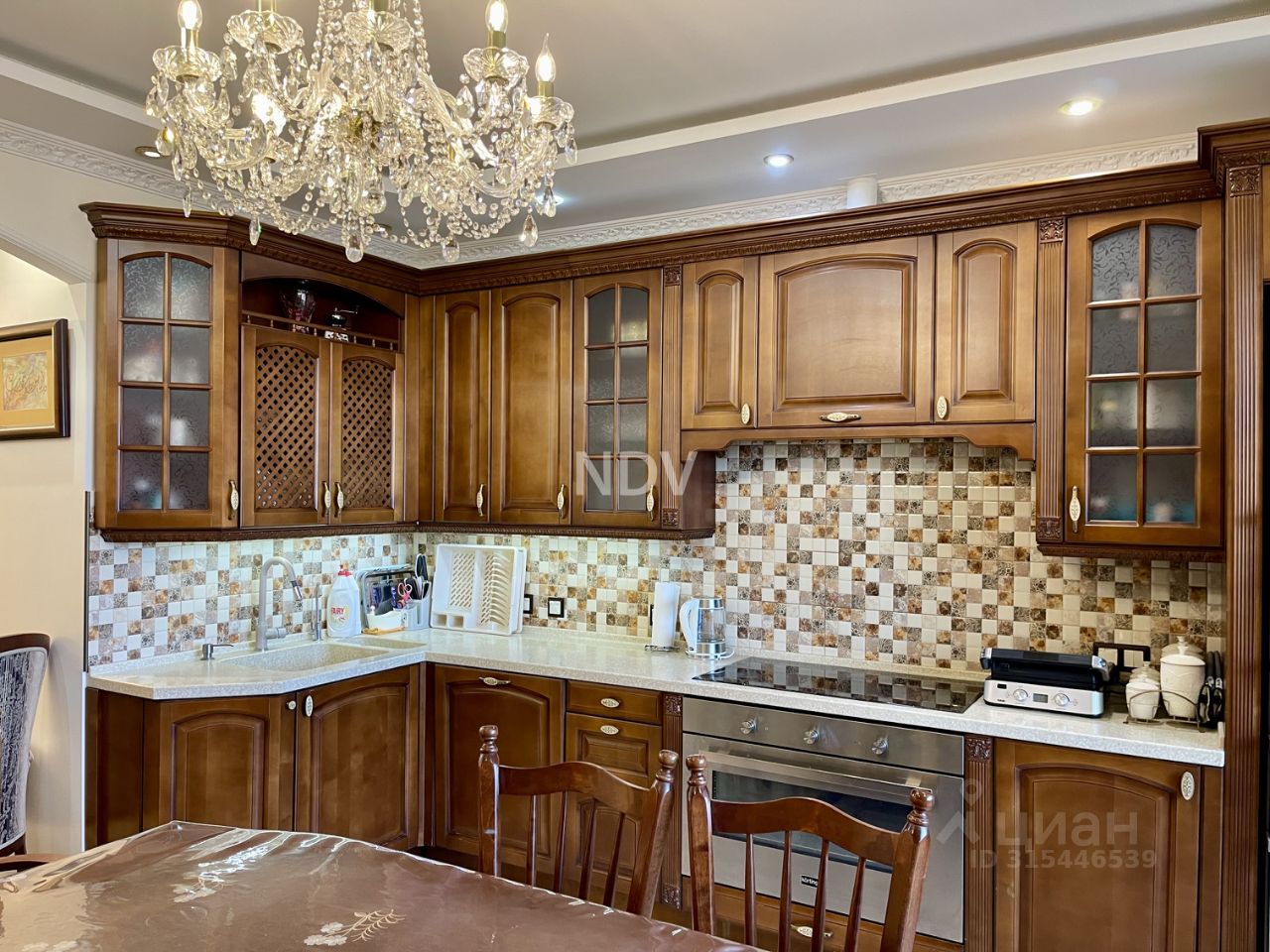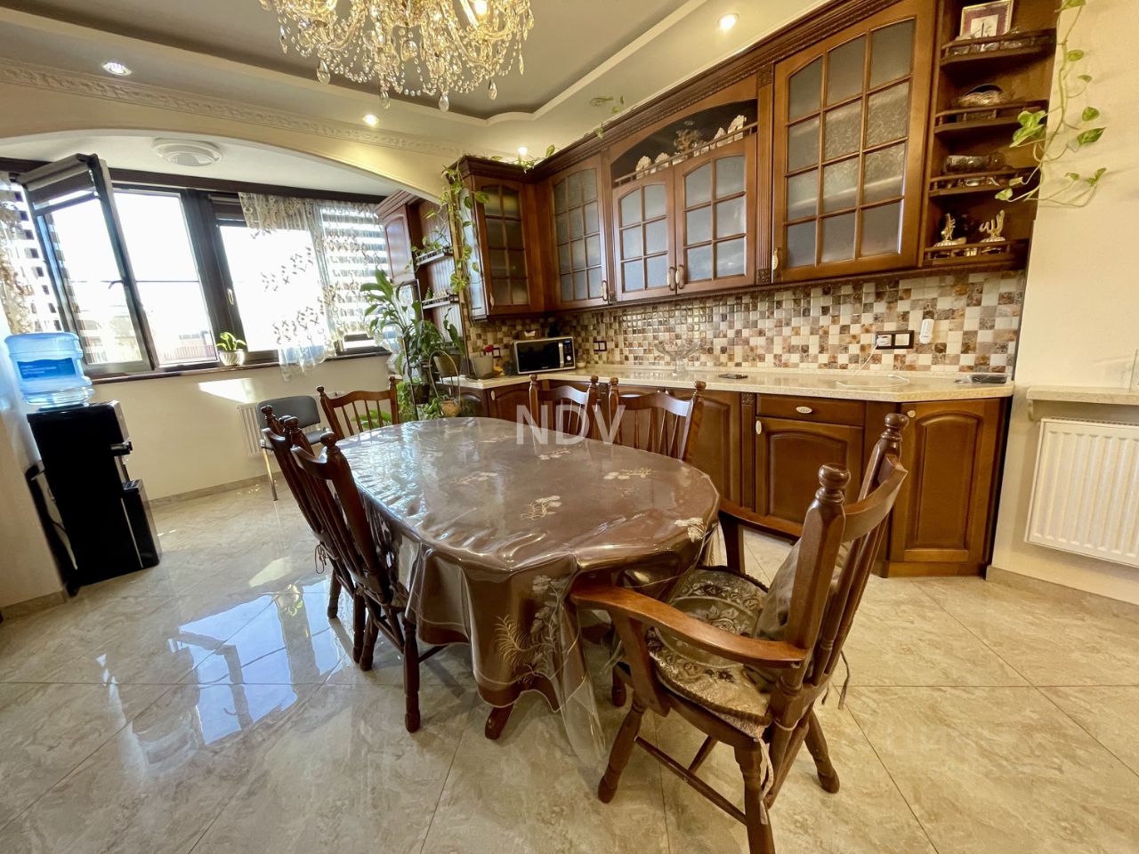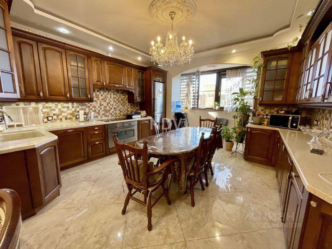 В интерьере использованы качественные материалы, двери и весь кухонный гарнитур из массива дуба, что гарантирует долговечность и надежность. Каждый элемент продуман до мелочей.