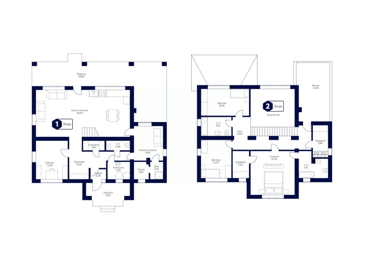 Особый шарм коттеджу придают терраса площадью 49 кв.м и приватный балкон (21 кв.м) с видом на сад. Здесь можно разместить уютный уголок для отдыха на свежем воздухе или обустроить место для барбекю.
