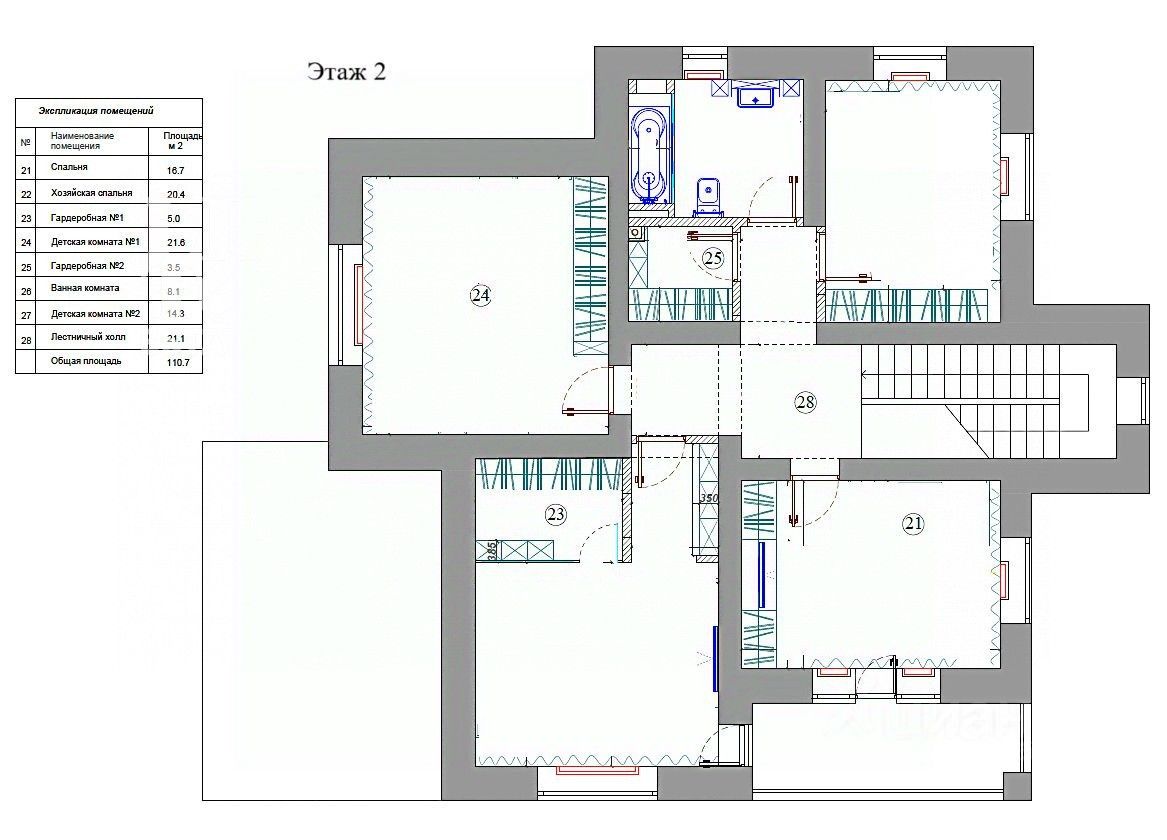 Второй этаж: мастер-спальня с гардеробной и балконом, спальня с балконом, кабинет, детская спальня, гардеробная, санузел с ванной.