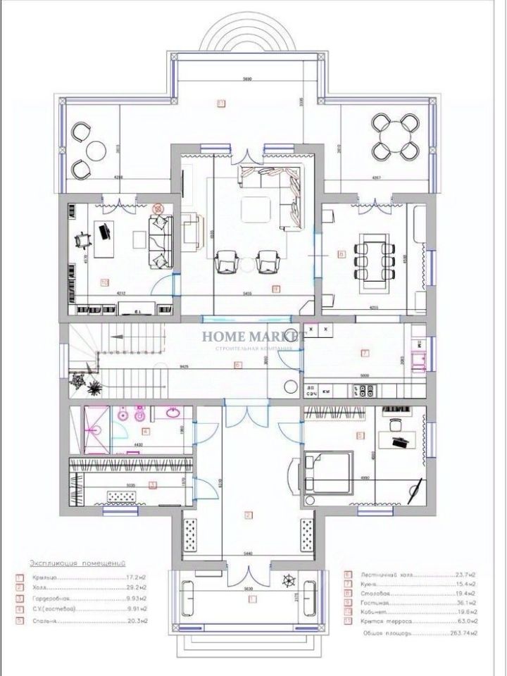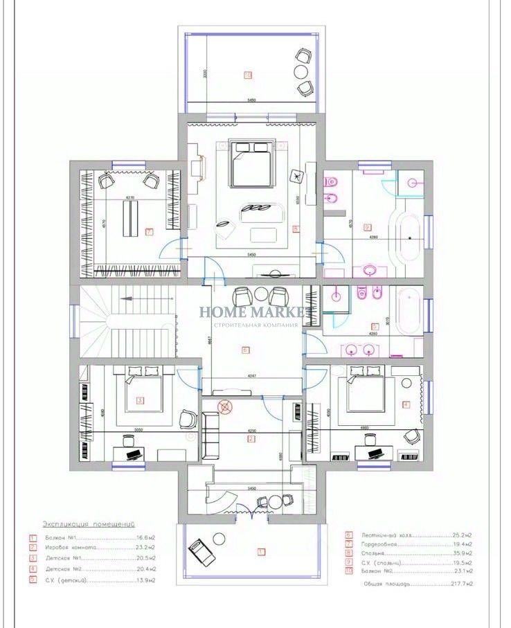 Первый этаж: просторная кухня-столовая с выходом на закрытую террасу, , гостиная с камином, прихожая, гардеробная , с/у гостевая спальня, кабинет Второй этаж: мастер спальня с гардеробной и ванной комнатой, 2 спальни, с/у с ванной, игровая (легко переделать в спальню)