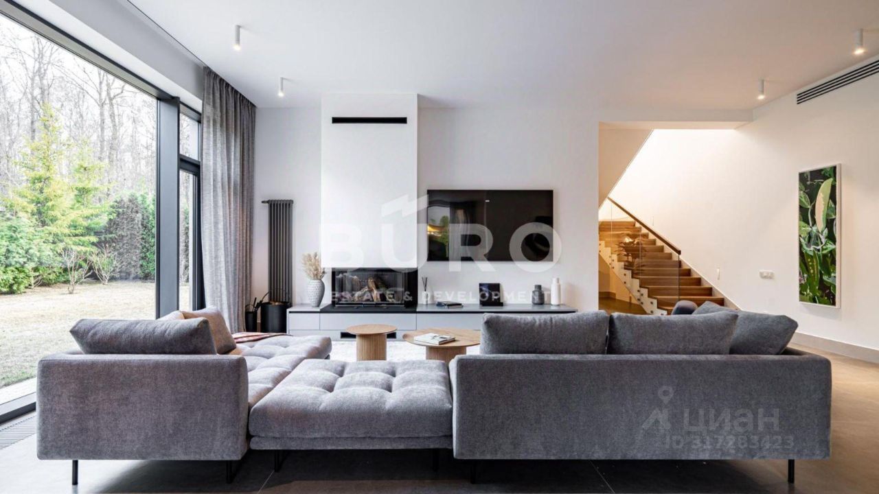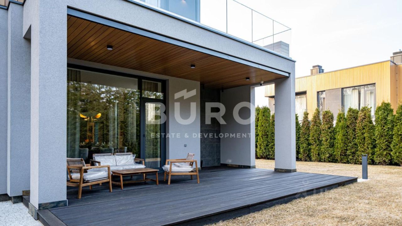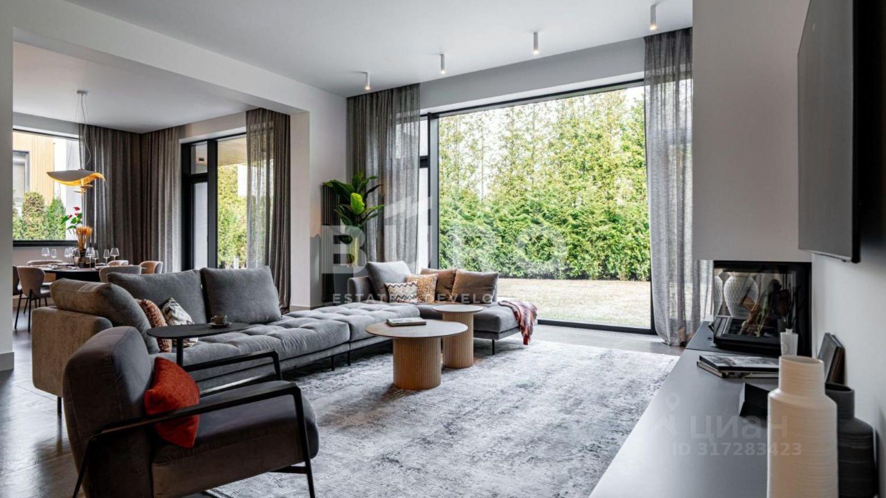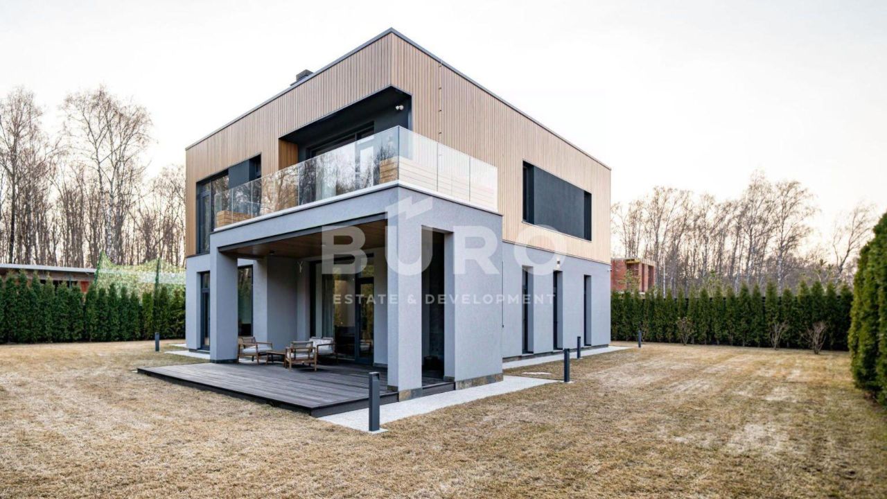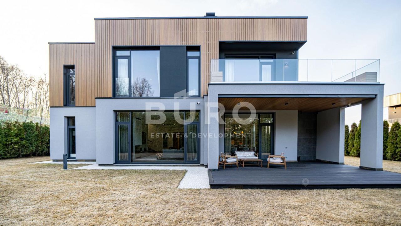 Современный дом возведён из высококачественных материалов в стиле известного архитектора Ф.Л. Райта. Из панорамных окон ''во всю стену'' открываются вдохновляющие виды. Большая площадь остекления и высокие потолки делают дом очень светлым и просторным.