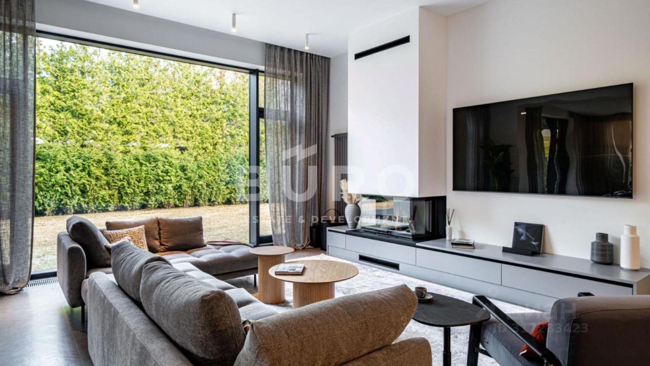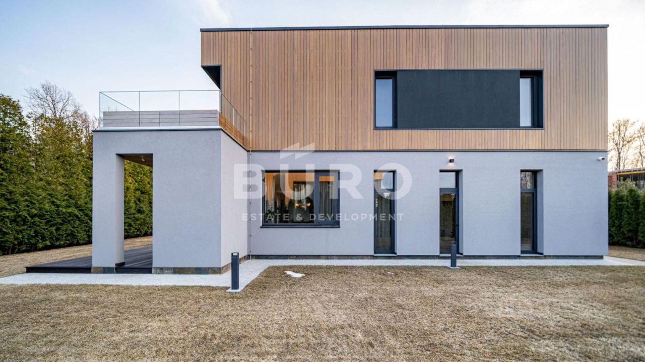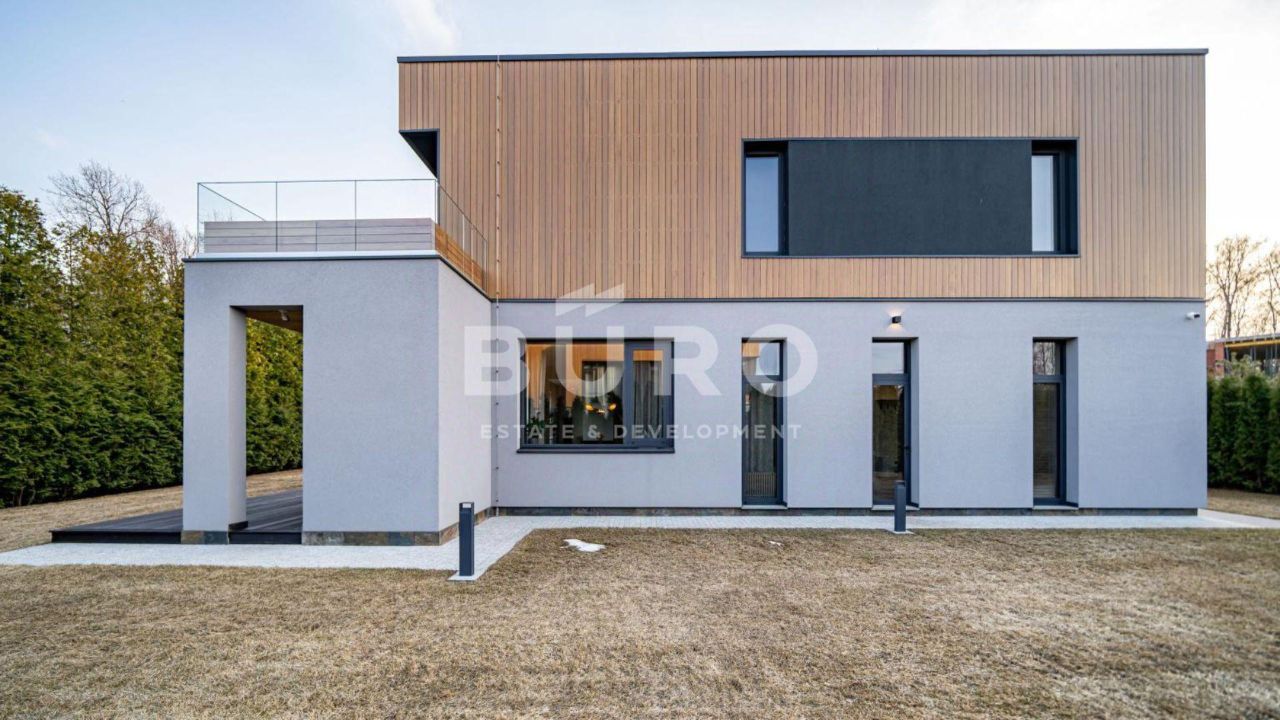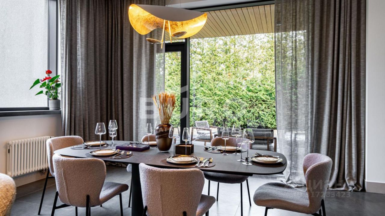 Современный дом возведён из высококачественных материалов в стиле известного архитектора Ф.Л. Райта. Из панорамных окон ''во всю стену'' открываются вдохновляющие виды. Большая площадь остекления и высокие потолки делают дом очень светлым и просторным.