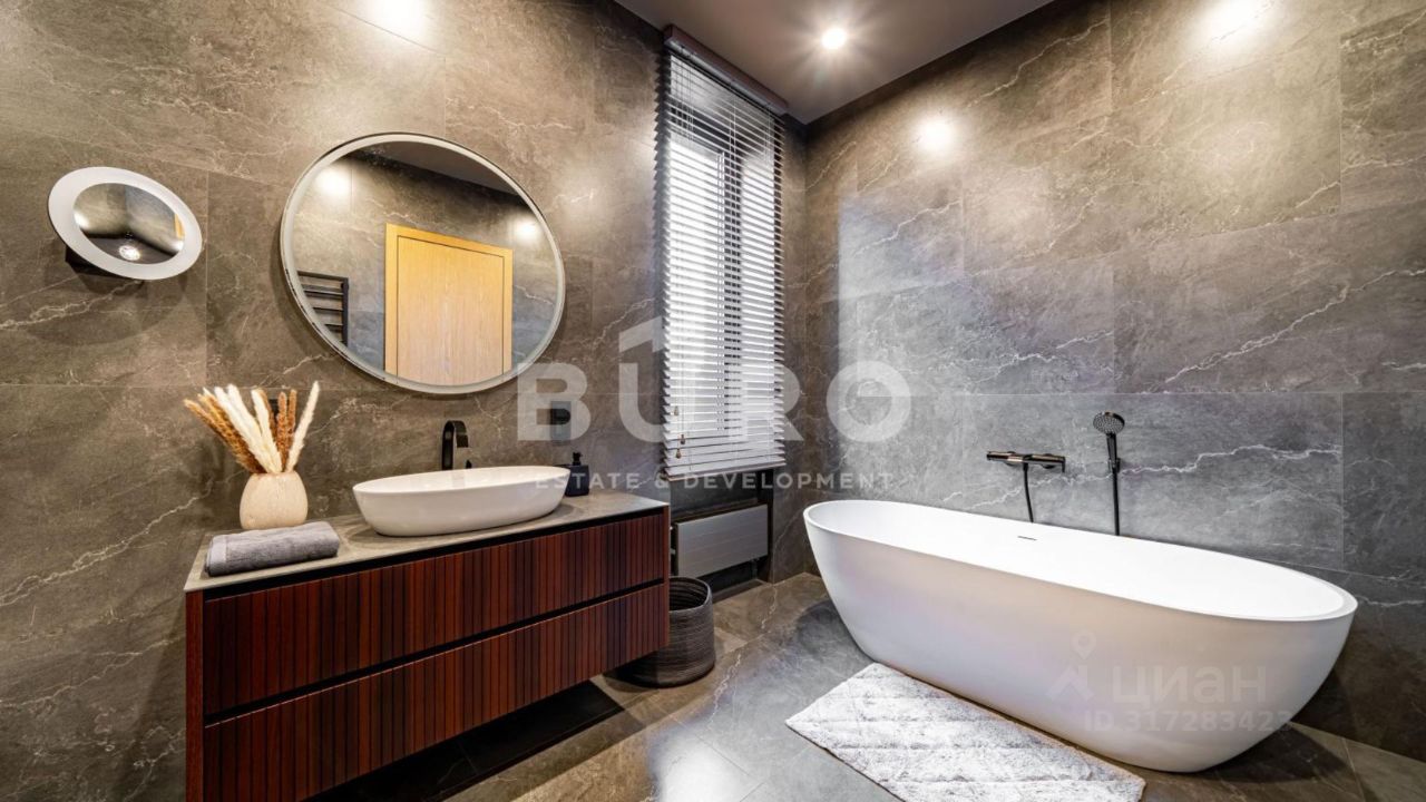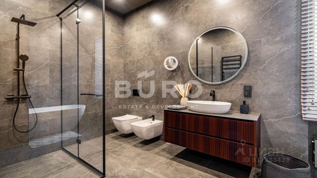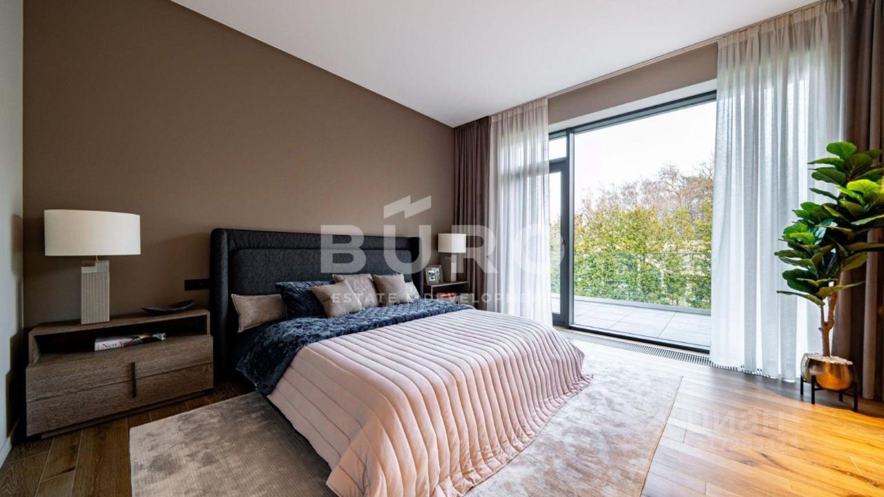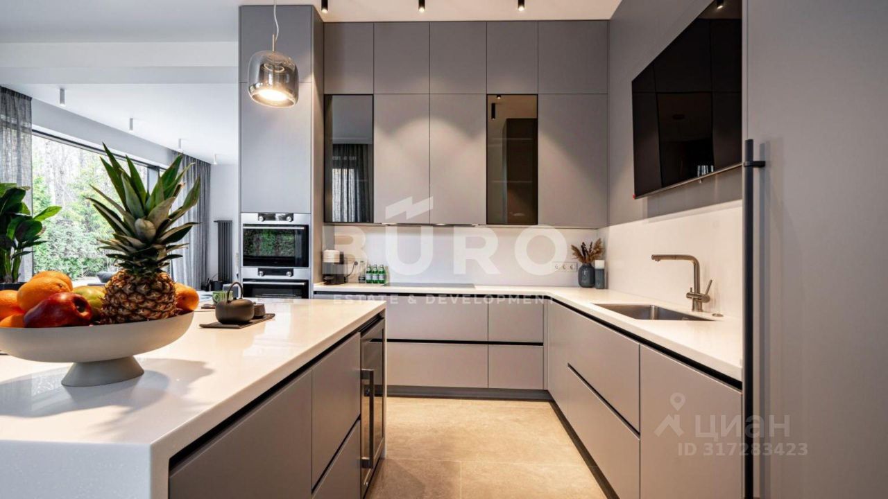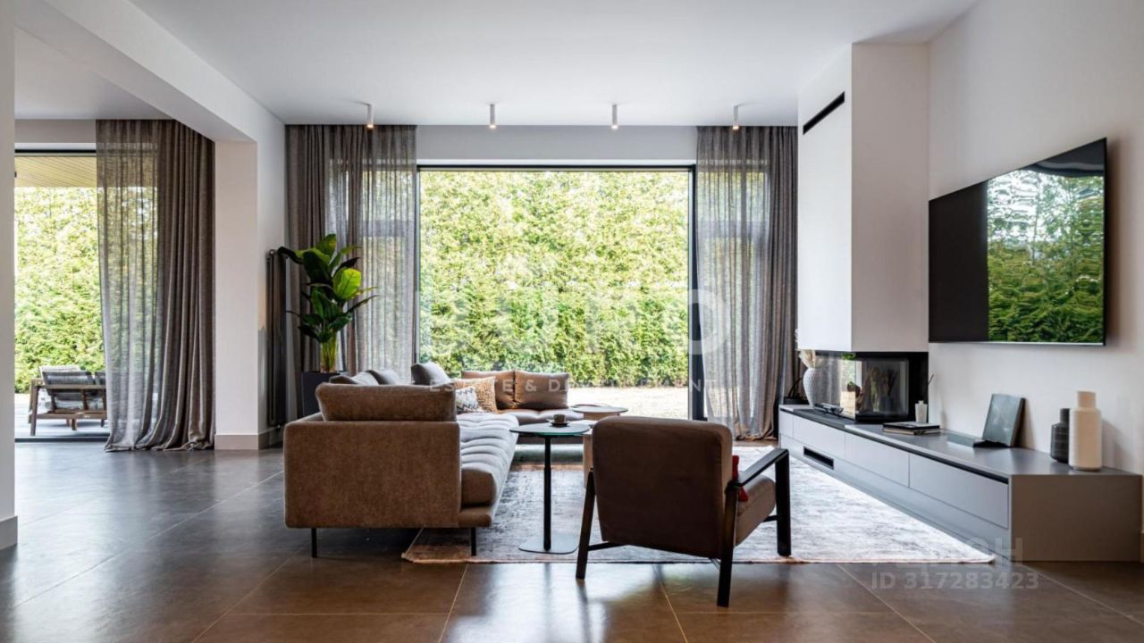 Современный дом возведён из высококачественных материалов в стиле известного архитектора Ф.Л. Райта. Из панорамных окон ''во всю стену'' открываются вдохновляющие виды. Большая площадь остекления и высокие потолки делают дом очень светлым и просторным.