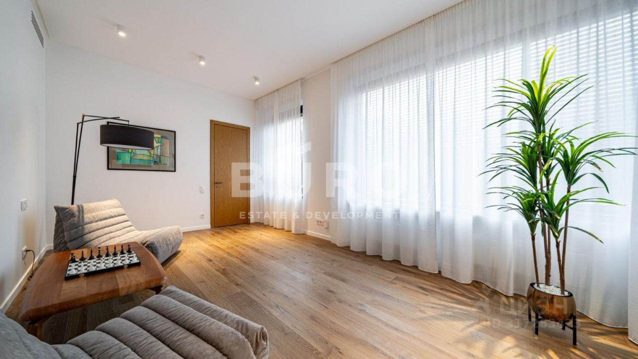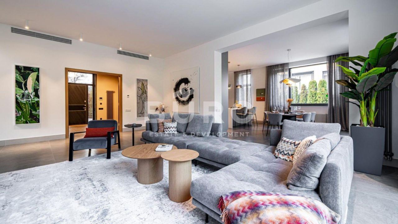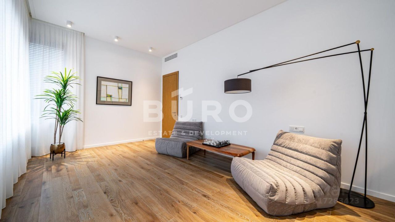 На первом этаже: холл, гардеробная, кухня-гостиная с выходом на террасу, санузел, котельная, хозяйственно-постирочная зона и блок персонала с отдельным входом в дом, который можно использовать как гостевую спальню, гараж для 2-х автомобилей.