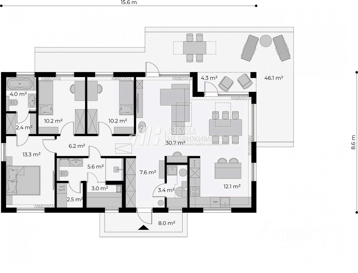 Дом включает две большие спальни по 13,5 кв.