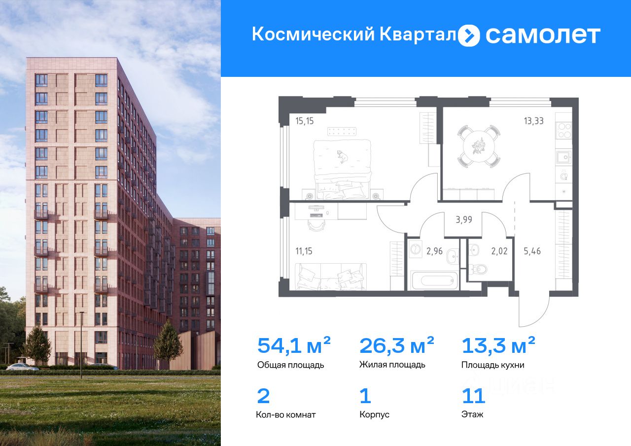Строим кварталы для жизни с заботой о будущем. Предлагается 2-комнатная квартира комфорт-класса 54,06 кв.м в корпусе 1 на 11 этаже, в ЖК ''Космический Квартал'' Квартира без отделки. Доступность опции ''отделка'' и возможность комплектации мебелью и декором уточняйте у застройщика.