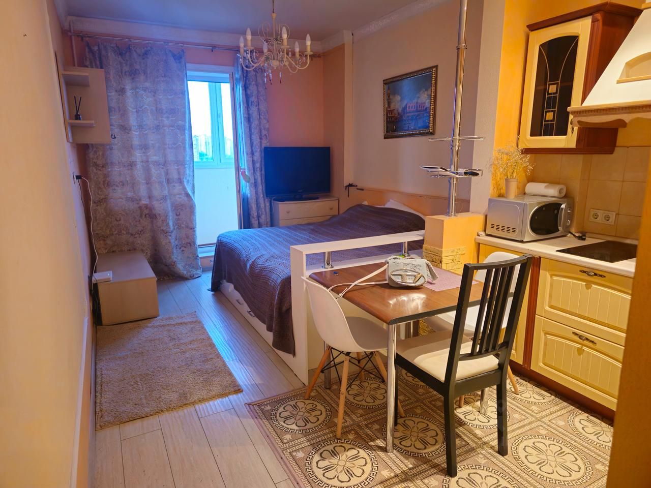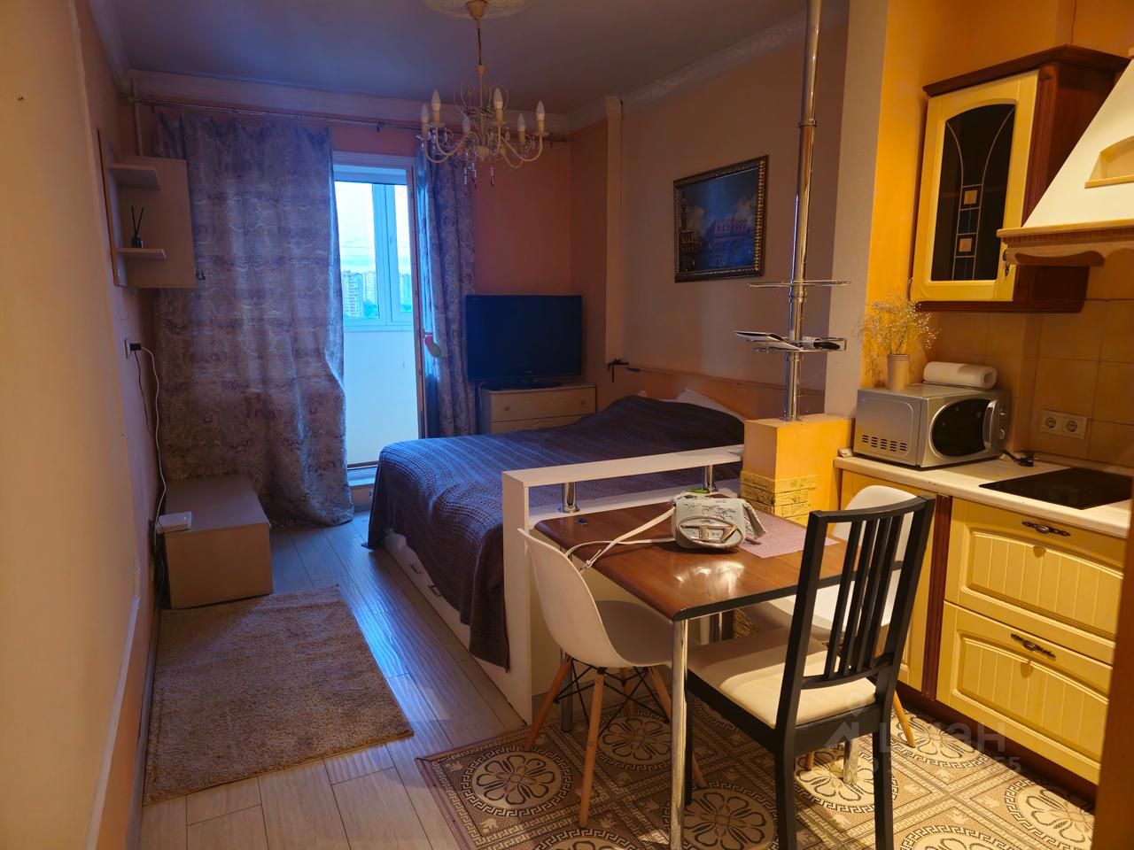 Уютная студия с лоджией. Вид из окна на реку. Есть всё необходимое для жизни.