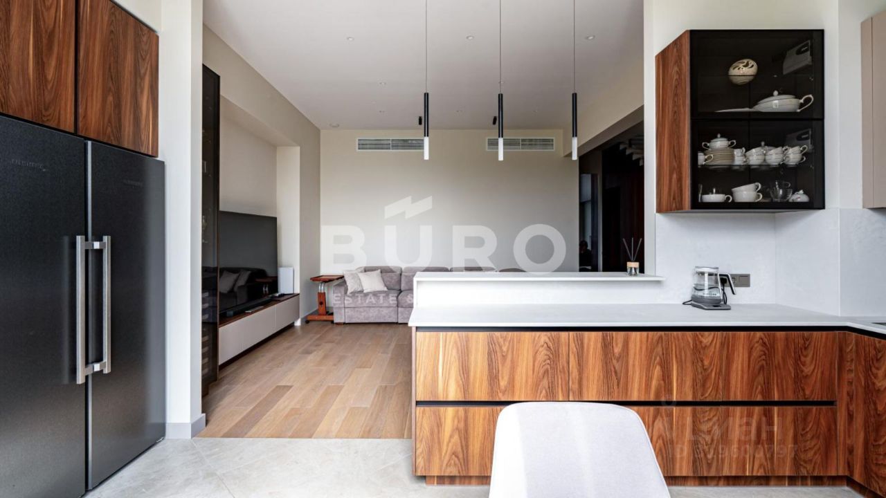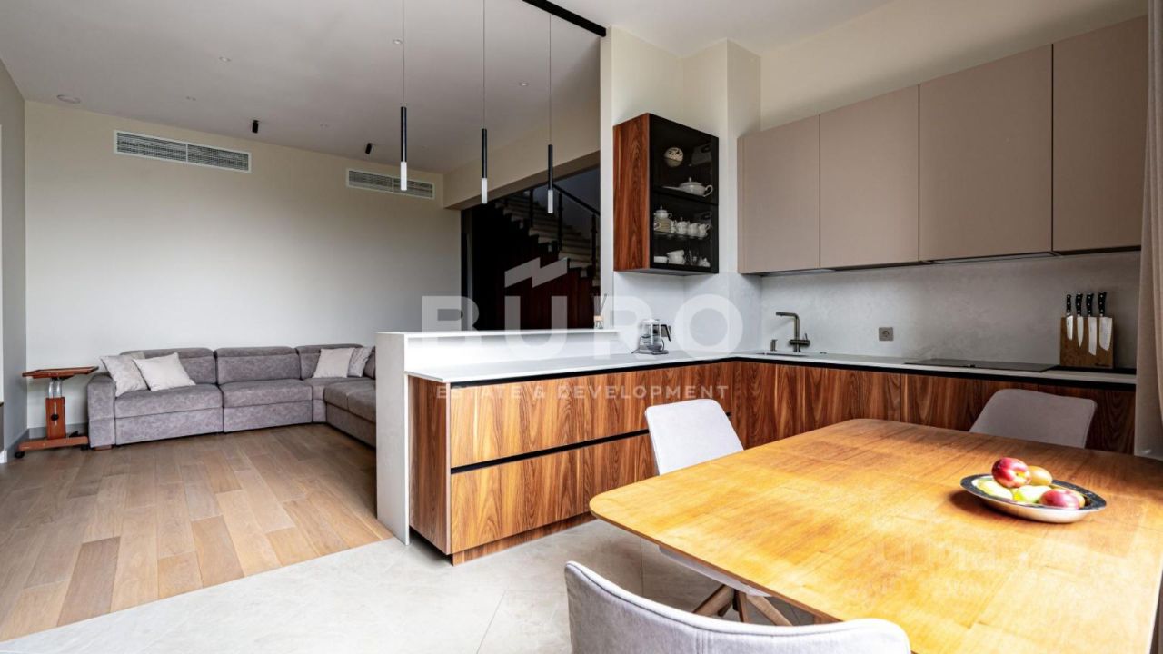 Просторный таунхаус с превосходной отделкой возведен в престижном, экологически чистом Истринском районе Подмосковья и является отличной альтернативой городской квартире. В коридорах и спальнях полы выполнены из инженерной доски. Предусмотрены также теплые полы под керамогранитом. Современный интерьер в светлых тонах дополнен стильной мебелью и предметами декора. Кухня оборудована бытовой техникой ''NEFF'', ''Miele'' и ''Liebherr''. В постирочной - техника ''Miele''.