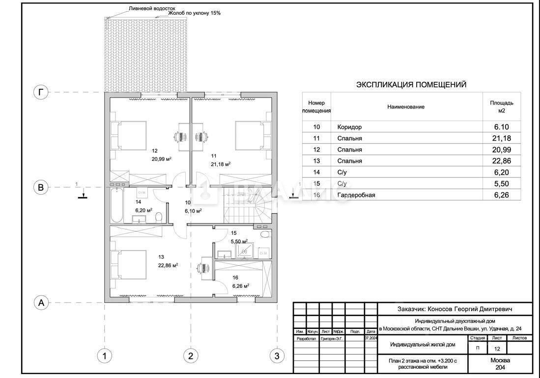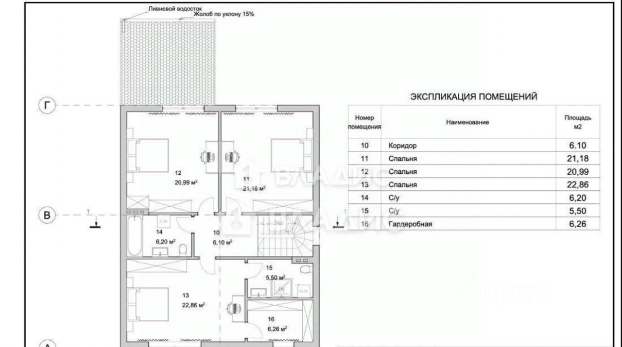 2 этаж: коридор 6,1 м², мастер-спальня площадью 21,18 м² с санузлом 6,2 м² и гардеробной 6,26 м², спальня 20,99 м², спальня 22,86 м², санузел 5,50 м².
