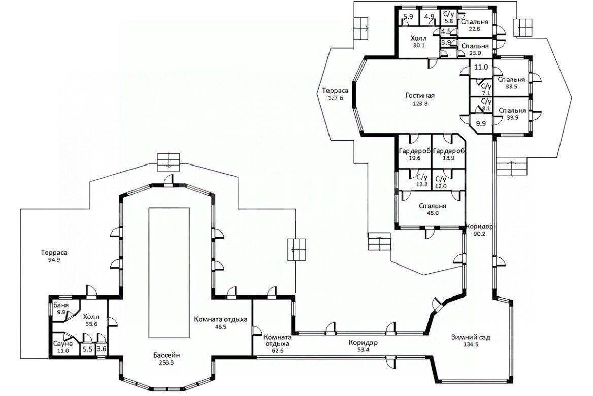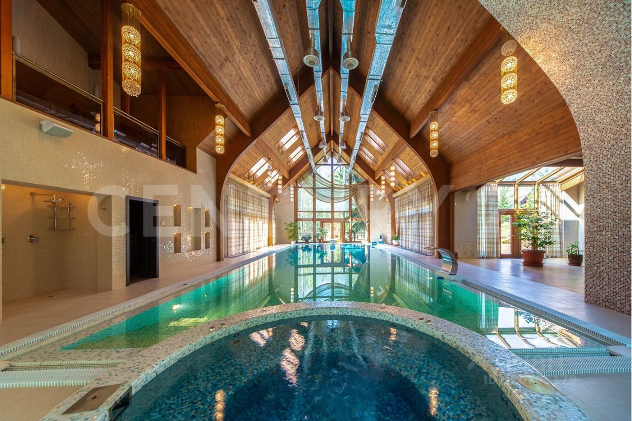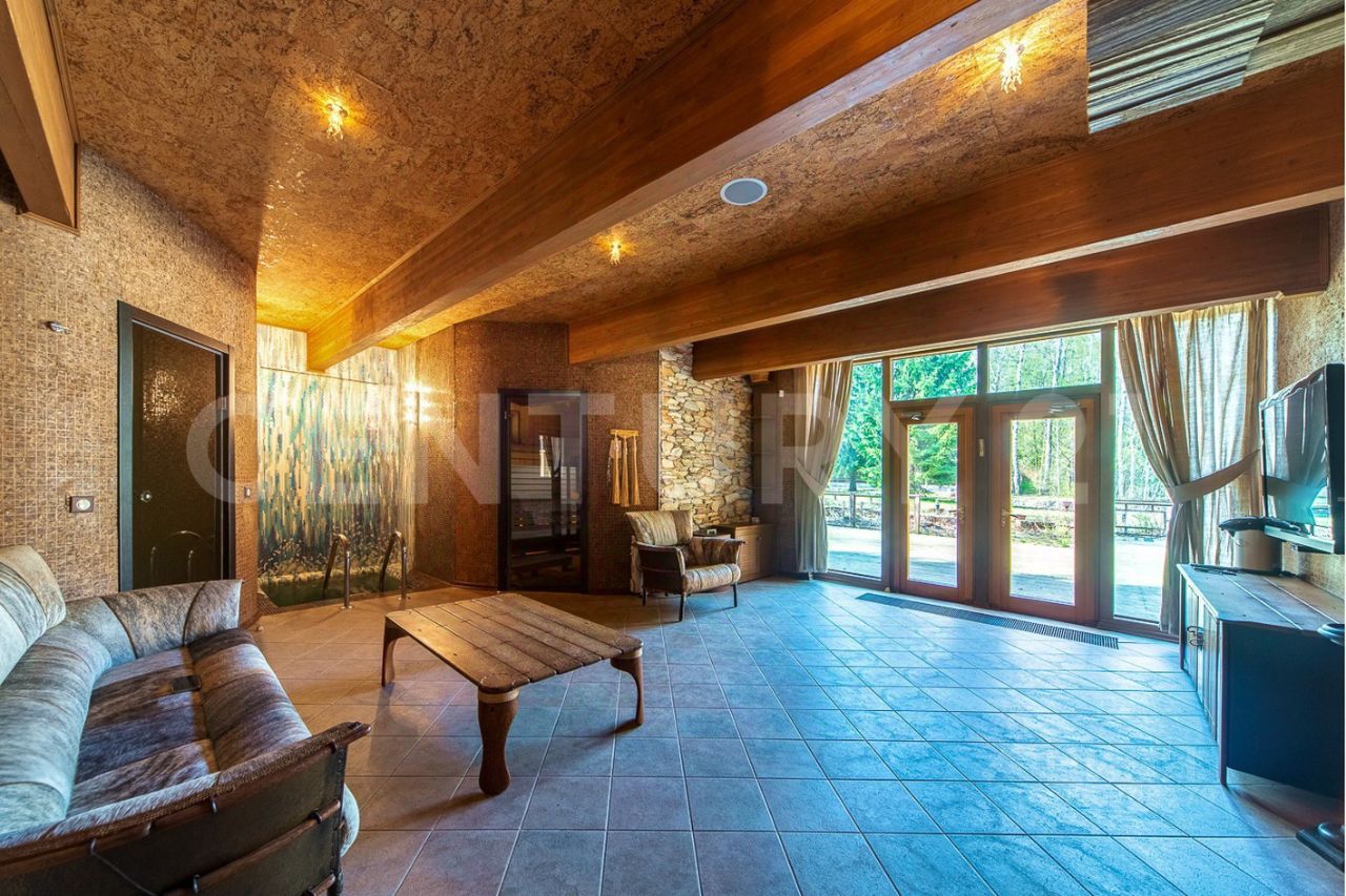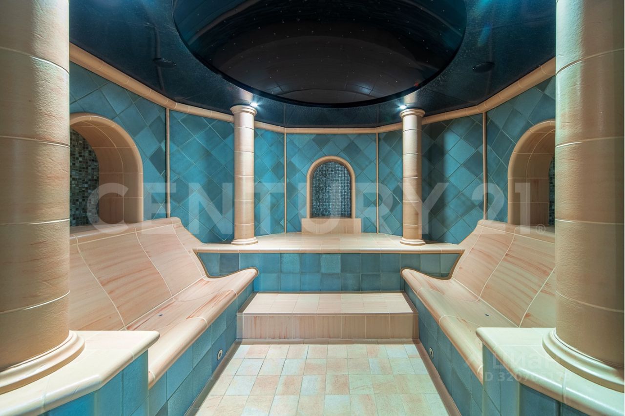 СПА расположен в отдельном крыле, оно соединяется с жилой частью красочной галереей с панорамными окнами и зимним садом. Есть спортивный зал, бассейн 12*5 метров, джакузи, хамам, сауна, баня, купель.