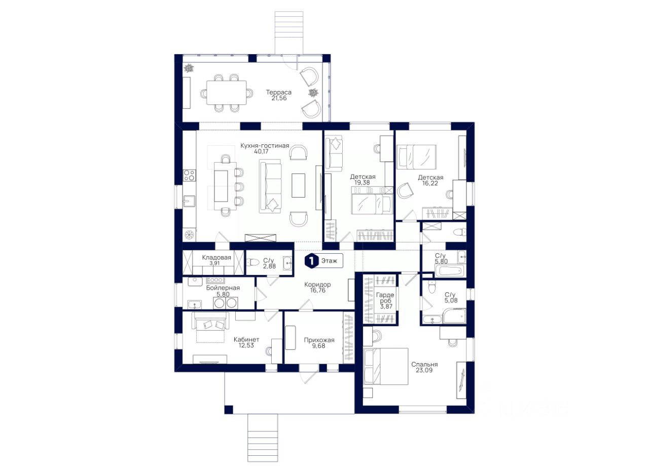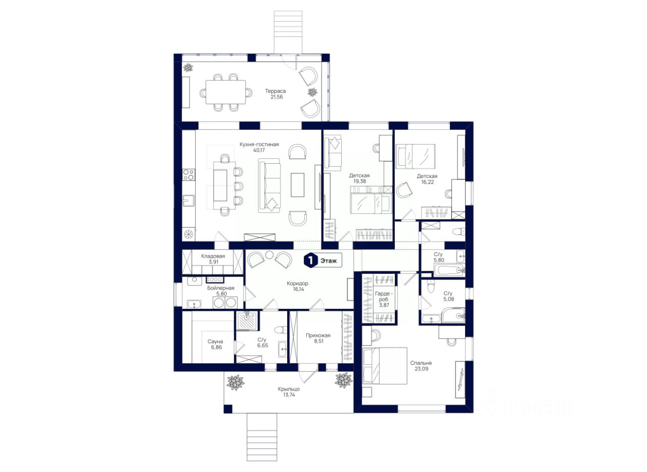 ОСНОВНЫЕ ХАРАКТЕРИСТИКИ - Общая площадь: 202 м² - Площадь участка: 7.99 сот. - 1 этаж - 3 спальни - 3 ванные комнаты - Терраса: 21.56 м² - Сауна с душевой - Объединенные кухня и гостиная - Отделка: Получистовая