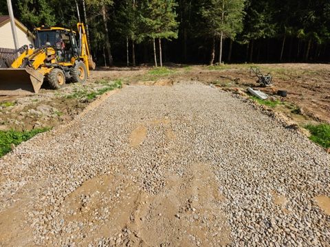 Сделана площадка для автомобиля. Электричество 15 кв. Сделан въезд на участок