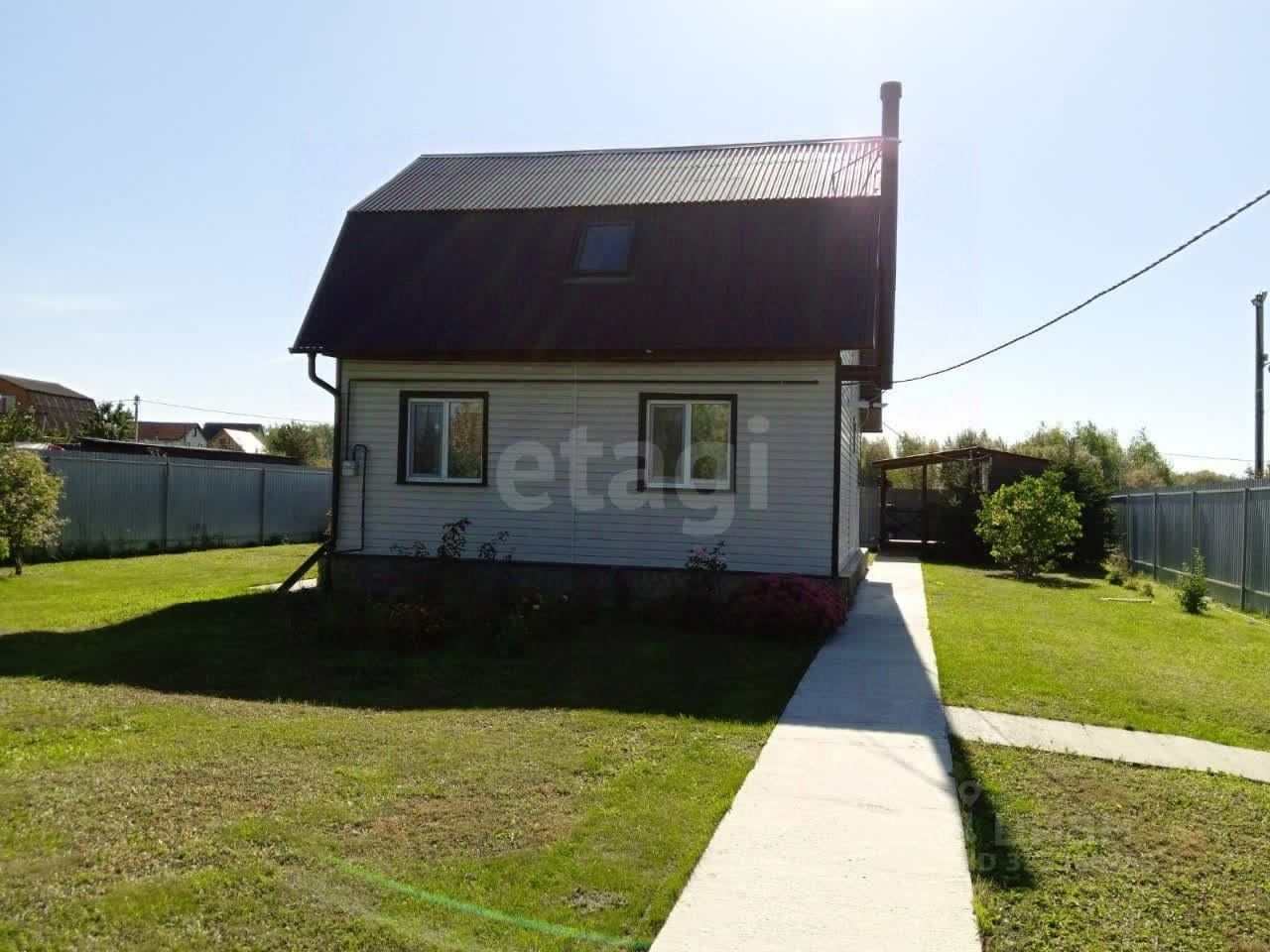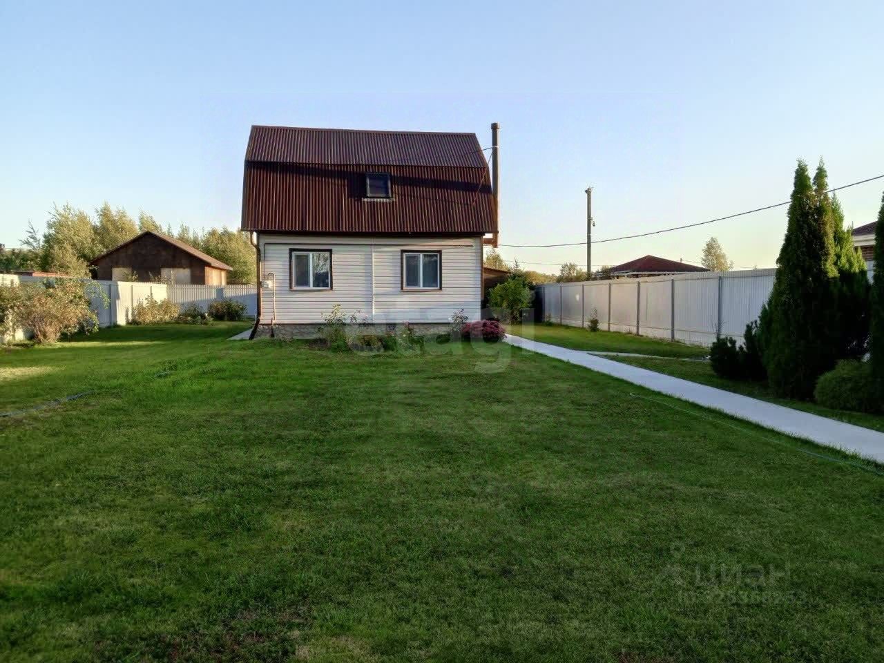 Планировка дома функциональна: на первом этаже расположены прихожая, кухня, гостиная и совмещенный санузел, на втором — две изолированные спальни. Отдельное хозяйственное помещение имеет собственный вход. Дом продается полностью меблированным и оснащенным необходимой бытовой техникой, что позволяет заселиться сразу после покупки. Участок не только ухожен, но и плодоносит: здесь высажены яблони, груши, вишня, черешня, а также ягодные кустарники — голубика, смородина, малина. Ландшафтный дизайн дополнен хвойными насаждениями, сиренью, розами, пионами и многолетними цветами. Инфраструктура поселка включает четыре магазина, амбулаторию, школу, детский сад, дом культуры, пункты выдачи Wildberries и Ozone, а также храм. В 200 метрах от дома находится автобусная остановка, обеспечивающая транспортную доступность. Объект представляет собой готовое решение для жизни за городом без необходимости дополнительных вложений.