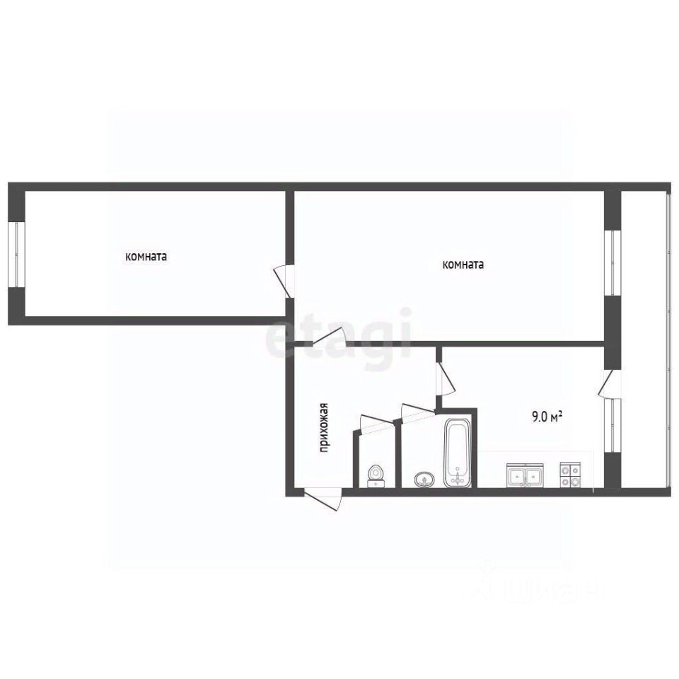 Планировка отличается функциональностью: две смежные комнаты, просторная кухня 9 кв. м, раздельный санузел и огромная застекленная лоджия 6 кв.м.