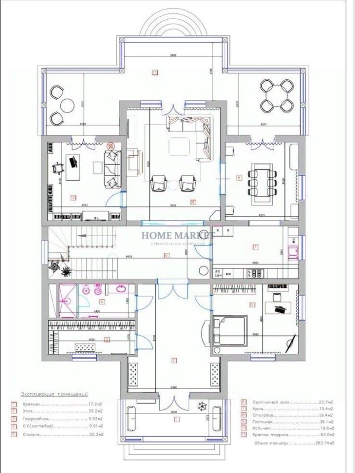 Первый этаж: просторная кухня-столовая с выходом на закрытую террасу, , гостиная с камином, прихожая, гардеробная , с/у гостевая спальня, кабинет Второй этаж: мастер спальня с гардеробной и ванной комнатой, 2 спальни, с/у с ванной, игровая (легко переделать в спальню)
